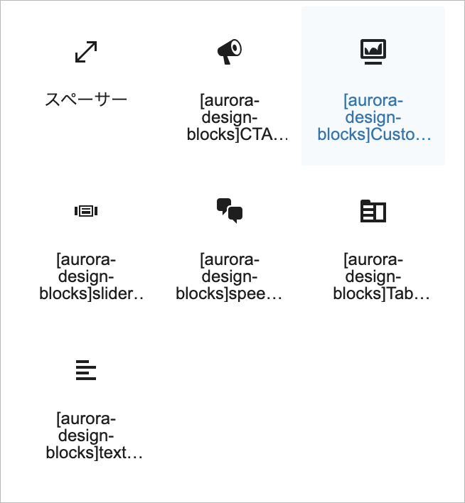 まずは、ブロックの追加画面を開き、Aurora Design Blocksの中から