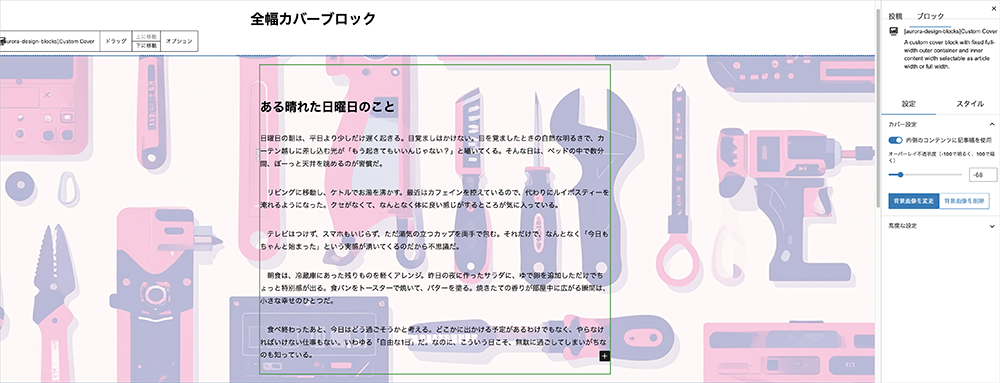 このブロックは、全幅で背景画像+内側にコンテンツを配置できる構造を持っています。