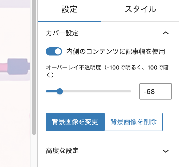 例)-68に設定すると、背景が淡くなり文字が読みやすくなります。