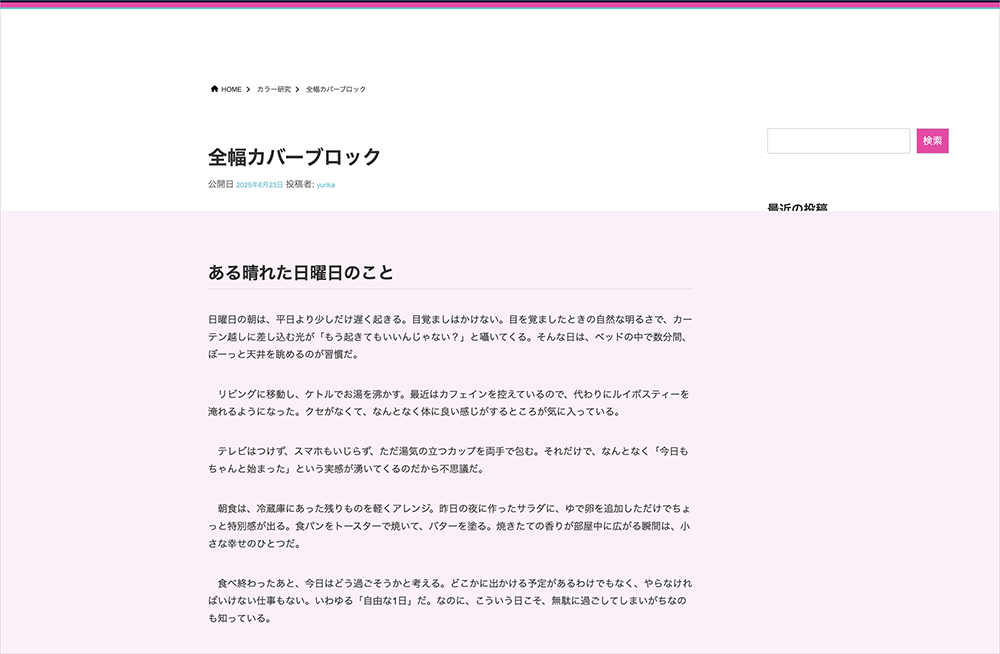 チェックを入れると、テキストなどの中身部分が「記事幅」内に収まるようになります。ページ全体のデザインとバランスを取りたい場合は、ONがおすすめです。