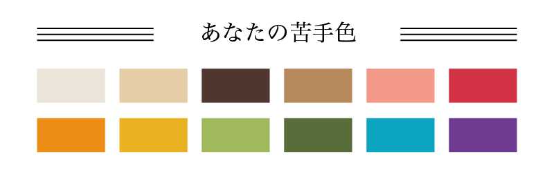 彩度の低い黄色味の色が苦手です。苦手色を顔まわりに持ってくると、顔が黄ばんで見えるので注意しましょう。