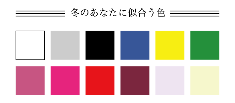 個性的で堂々とした雰囲気の冬タイプ。ツヤのある黒髪と瞳の持ち主が多いのが特徴です。黒目と白目の境界がハッキリしており、白目が青みがかった方も多いです。色もハッキリとしたものが得意です。
