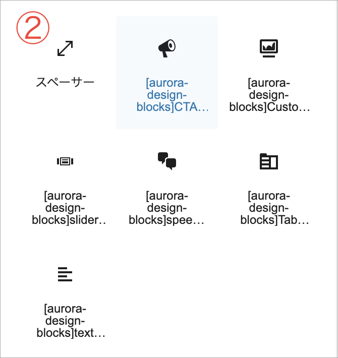ブロックパネルから「[aurora-design-blocks]CTA…」を選択(拡声器アイコンが目印)してクリック。