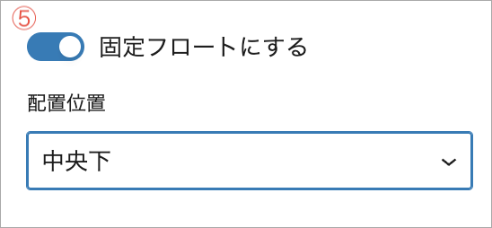 右側のブロック設定パネルで「固定フロートにする」をONにし、配置位置を「中央下」などに設定します。